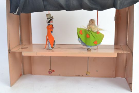 TIN PLATE THEATRE: A vintage ' Play Charm ' tinplate folding childs puppet theatre - complete, along with 2x puppets.