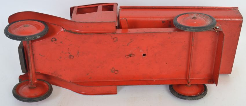 TRIANG: A fabulous c1930's / 1940's Triang / Lines Brothers made metal tipper truck. Red hubs, with red body and original wheels. With lever action to side. Rubbed ' Triang ' label remains to rear of tipper. 48cm long.
