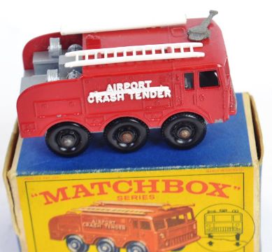 MATCHBOX LESNEY: An original vintage diecast model Matchbox Series Lesney No.63 Fire Fighting Crash Tender. Within the original box. Black plastic wheels,red body, white plastic accessories. (top hoses are present, but not photographed)