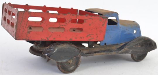 TINPLATE: A c1930's tinplate clockwork pickup toy truck, no makers mark, but with unusual clockwork mechanism to base. In red and blue.