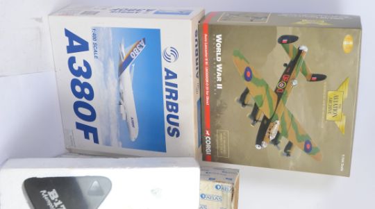 DIECAST PLANES: A collection of assorted diecast model aeroplanes to include; Corgi Aviation Archive AA30204, 2x Atlas Edition models and a collection of 6x Airbus issue boxed models on stands.