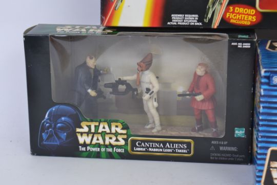 STAR WARS: A collection of 4x Star Wars action figure playsets to include; Galoob Star Wars Action Fleet Episode 1 Limited Edition playset, Episode 1 Qui Gon Jinn 12" action figure, a Kenner Power Of The Force set and a Hasbro Droid Fighters vehicle set. All within the original boxes.