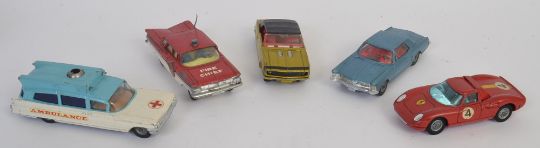 CORGI; A collection of 5x vintage loose Corgi diecast models; Superior Ambulance, Chevrolet Fire Car, Camaro SS (Take Off Wheels), Buick Riviera and a Berlinetta.