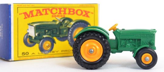 MATCHBOX LESNEY: An original vintage diecast model Matchbox Series Lesney No.50 ' New Model ' Tractor. Within the original box. Black plastic tyres, yellow hubs, yellow steering wheel.