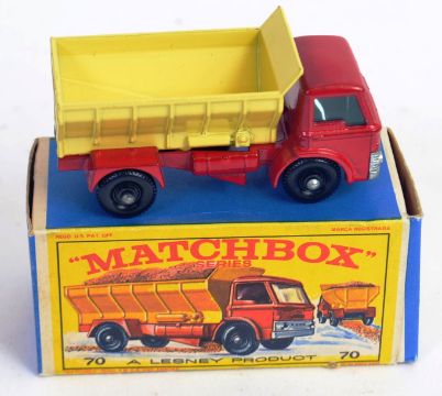 MATCHBOX LESNEY: An original vintage diecast model Matchbox Series Lesney No. 70 Grit Spreading Truck. Within the original box. Black plastic wheels, red chassis, yellow bay