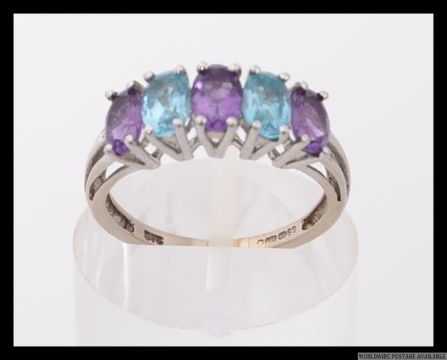 A 9ct white gold ring set with 5 alternating marquise cut blue and purple gemstones. Marked 375 GS. Weight 2.9g. Size P.