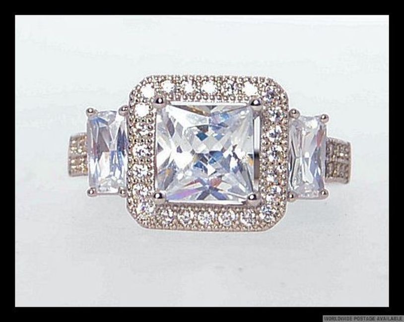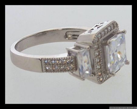 A 925 silver dress ring set with a large central princess cut CZ gem with pave set and baguette CZ gem shoulders within a pierced gallery. Size N. Weight 5.5g