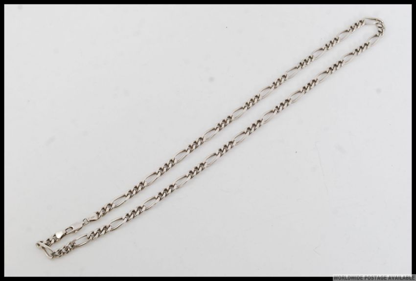 A silver figaro chain silver necklace with marks for silver Sheffield maker AJ Ltd. Length 20". Weight 27.7g.