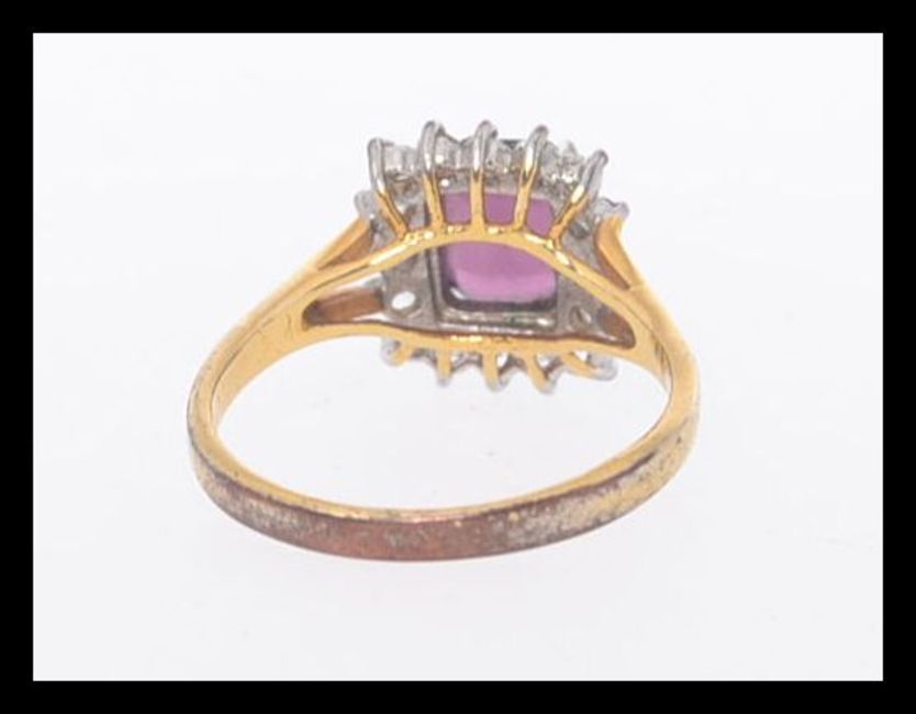 A 20th century yellow metal, amethyst and cz stone dress ring. The central amethyst being square cut. Size Q - Weight 2.6g