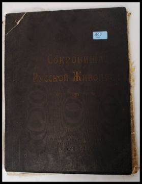 A collection of 20th century ' Treasures of Russian Paintings ' Set within black binder having tooled front with cyrillc writing. Inside a collection of 50 + paintings, each with notation etc ( see multiple illustrations )