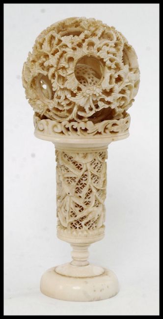 A circa 1900 Chinese carved and pierced ivory puzzle ball on stand. Comprising numerous finely carved spheres and raised on sectional stand in the form of a bamboo tree. H18cm
