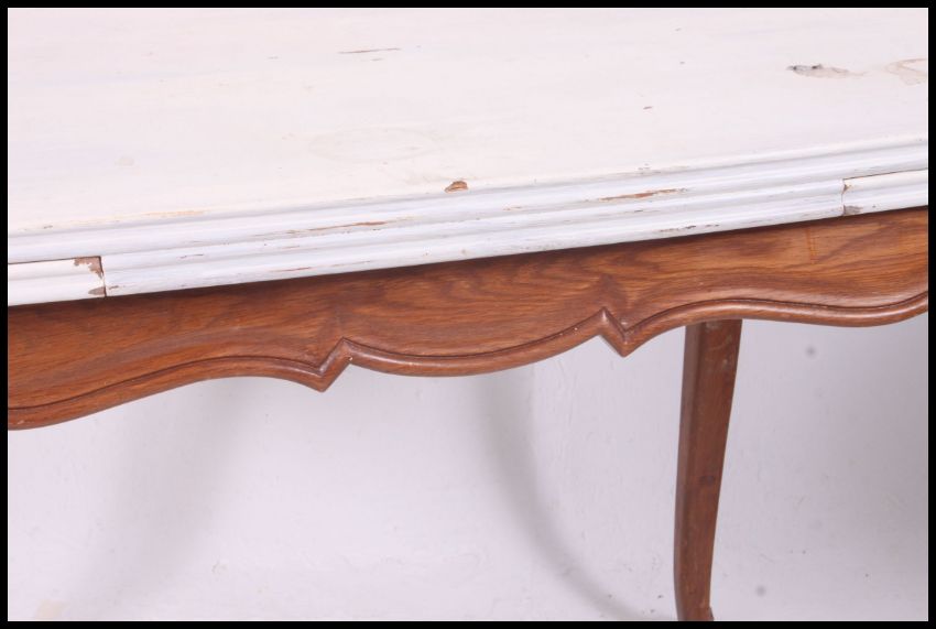 An early 20th century French provincial oak painted shabby chic draw leaf extending dining table. Raised on shaped legs with shaped frieze having extending top above. 76x99x74cm
