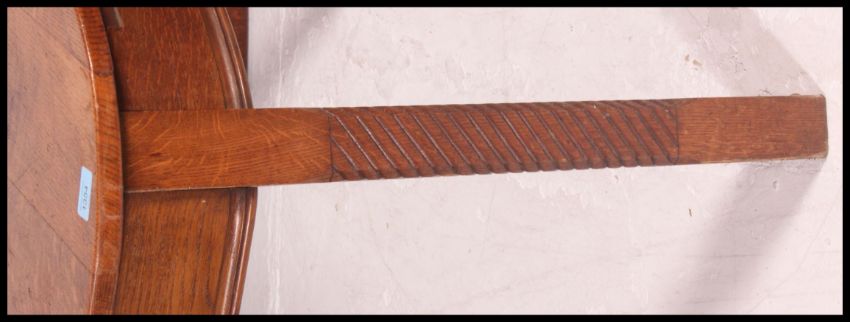 An early 20th century golden oak extending dining table. Raised on squared legs with reeded details complete with central leaf. Retailers labels for PE Gane of Bristol