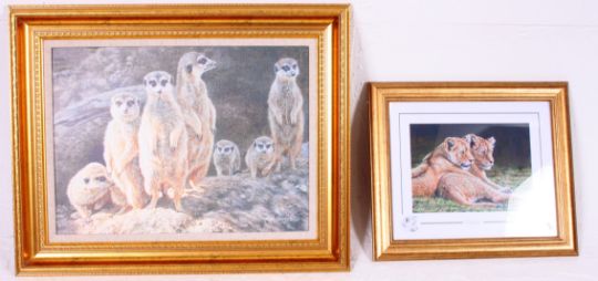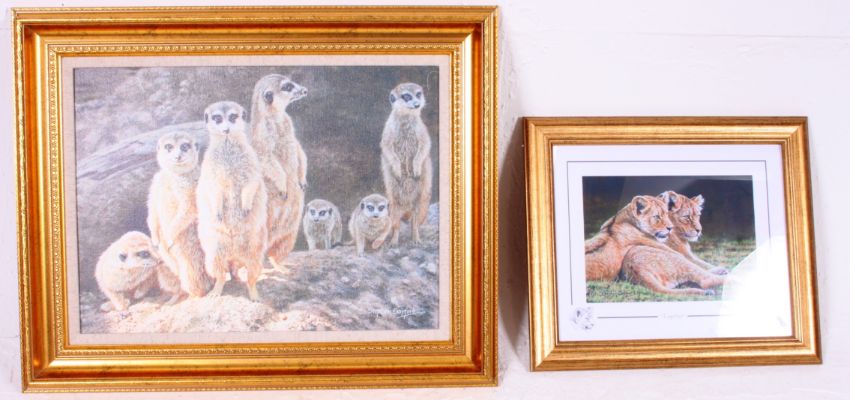 A framed picture of a Meercat family along with a framed Lion picture, both pictures signed by Stephen Gayford