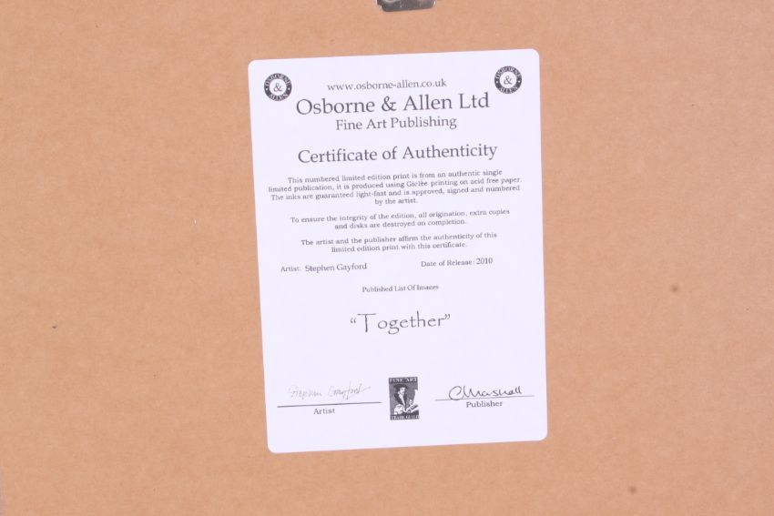 ARTISTS RE-SALE RIGHT. Buyers of the re-sold art of living artists will be charged the royalty where applicable. Currently this is 4% on any item sold at 1000 Euros or over, diminishing about 50,000 Euros. VAT is not applicable. Further details can be obtained from our office.