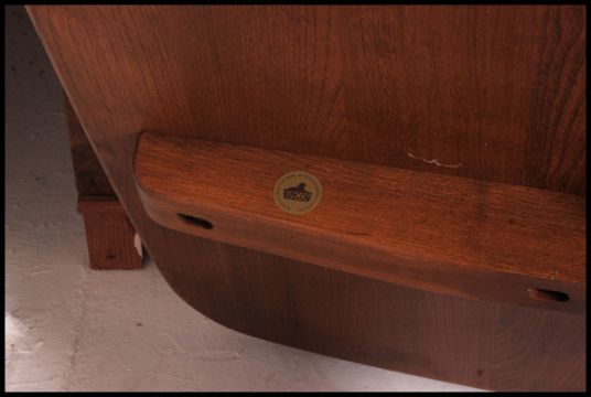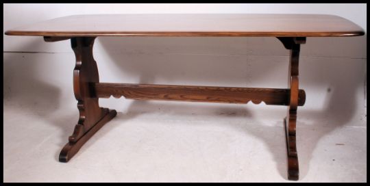 A large Golden Dawn Ercol refectory dining table raised on lyre shaped supports. This being the large example with elm chamfered edge top. Matching chairs in lot 1166a