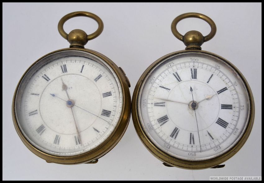A 20th century Tell chronometer / pocket watch. The dial with serial no 60744 which matches the movement. Set within brass case with plain cartouche to verso. Together with a near match watch being unmarked set in similar case, movement and case not marked
