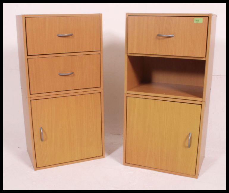 2 sets of contemporary light oak bedside cabinets. Each with a combination of either drawers or single locker cupboards. H44 x W40 x D30cm