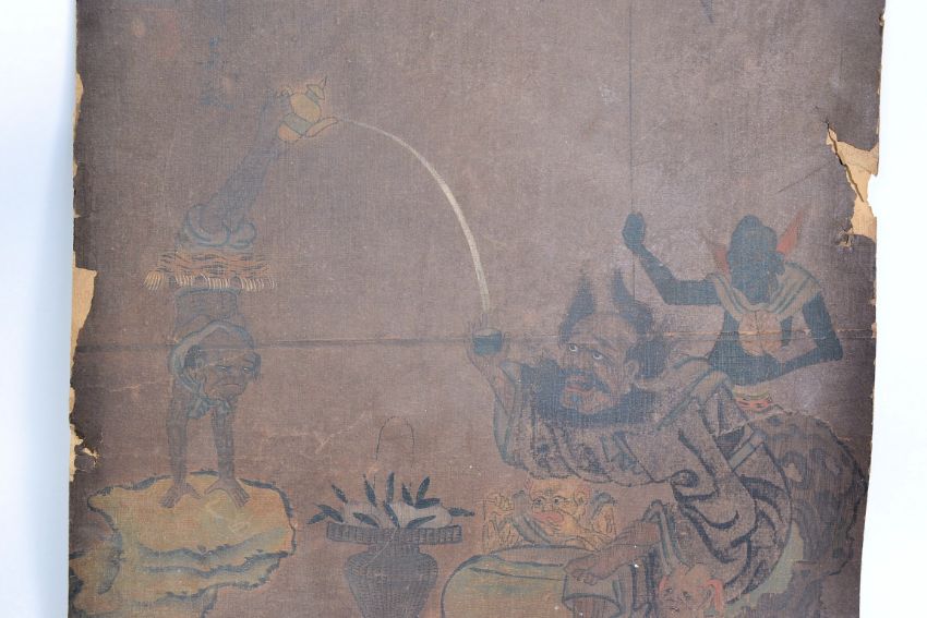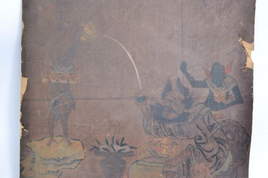 An oriental watercolour of an amusing acrobatic tea ceremony. Inscribed and laid onto card.