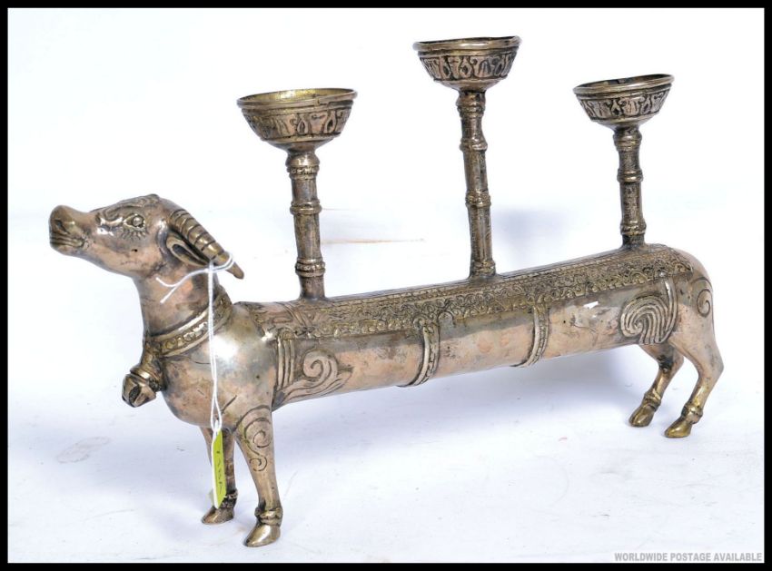 A 20th century white metal Indian elongated cow candlestick holder. 37cms long