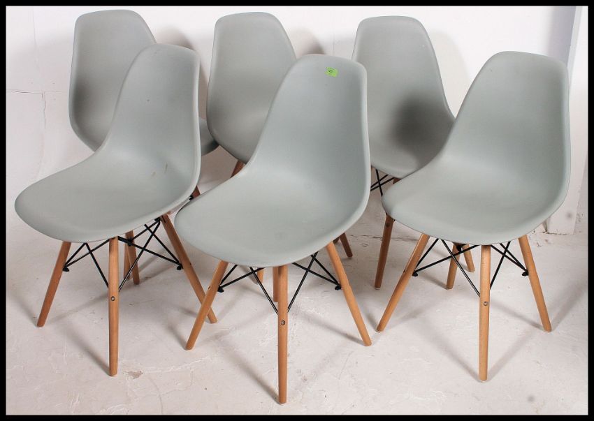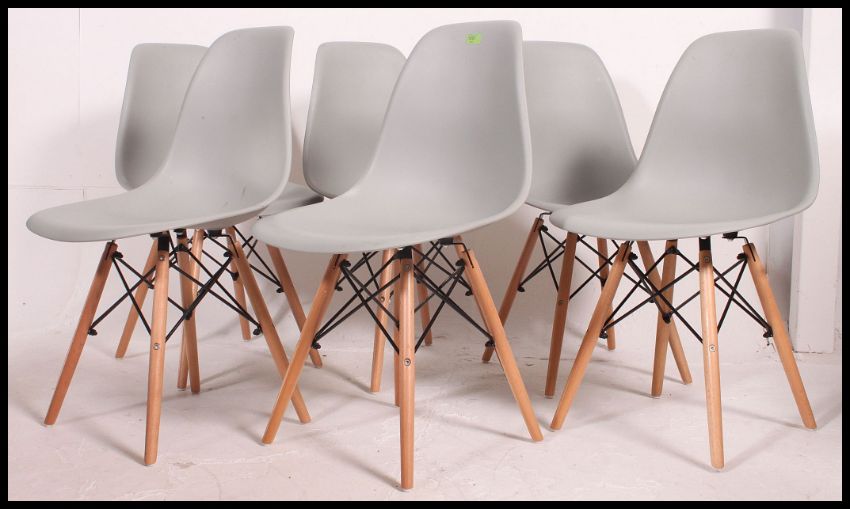 A set of 6 Eames style DSW dining chairs being raised on atomic style legs with upper peripheral stretchers. Ex James Martin Show BBC set furniture 83x46x40cm
