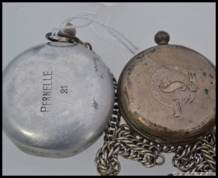 A silver metal cased pocket watch stamped to the movement Moulinie Geneve along with another silver metal pocket watch having a white enamle face and a gents Tissot Seastar Automatic wrist watch