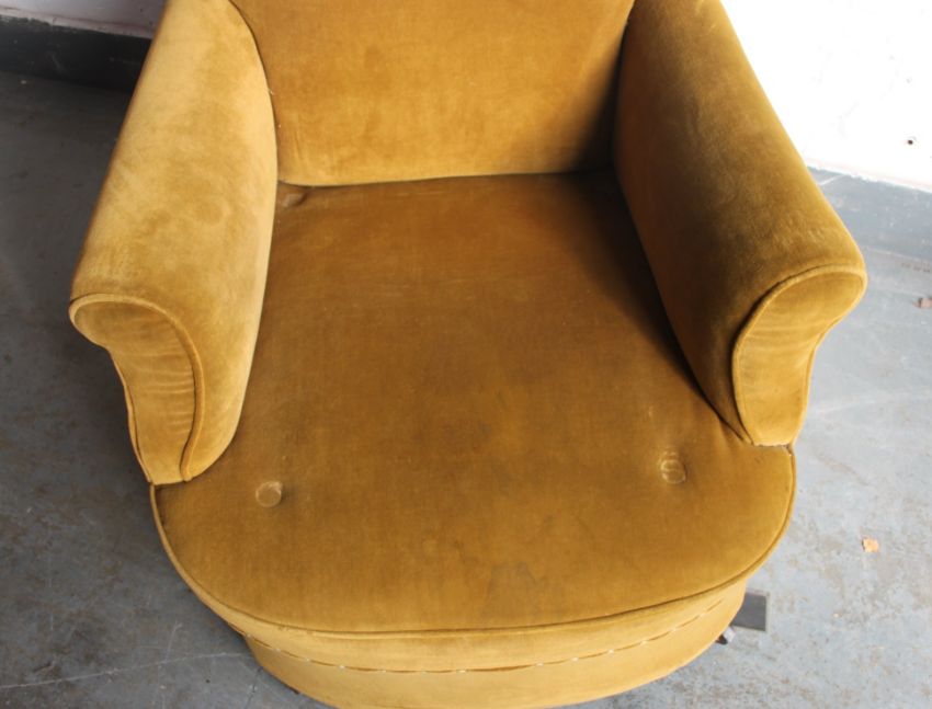 An early 20th century armchair having yellow velour upholstered overstuffed and sprung frame