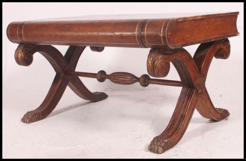 A 20th century large coffee / occasional table in the form of a book having spine drawer being raised on cross stretcher legs