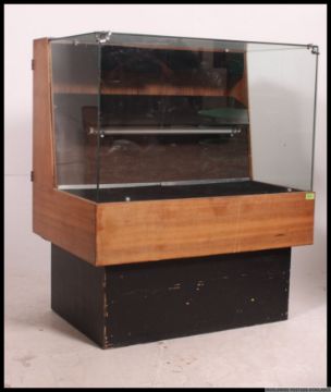 A retro 1970's glazed haberdashery shop display counter, shelved, raised on an ebonised square base