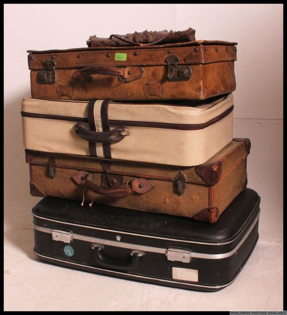 A stack of vintage and retro suit cases to include a stunning leather example along with Demob, Alligator skin handbag 17x65x40cm