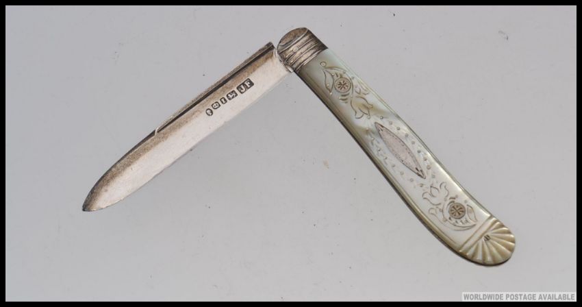 A small hallmarked silver bladed fruit knife / pen knife, with highly detailed mother of pearl and stone inlaid handle. Makers JF, Sheffield hallmarks