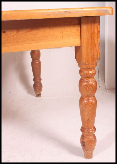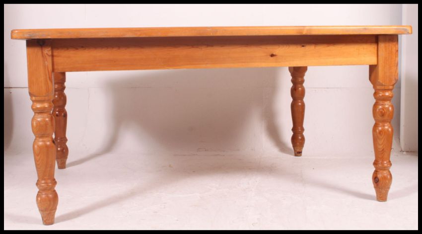A very large contemporary country style pine dining table. Raised on turned legs with fitted frieze having flared square top above. H77 x W129 x D161cm