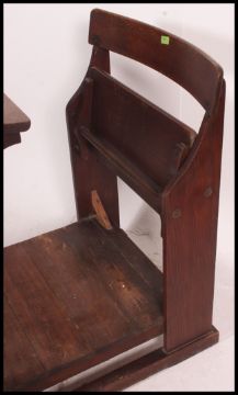 A fabulous large late 19th century oak lecturers / teachers desk and bench seat combination. The hinged top desk having fitted seat that raises, back rest to rear