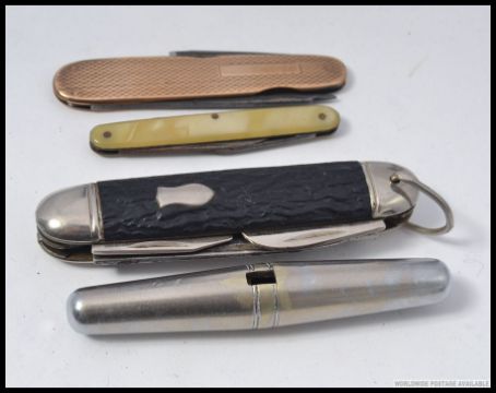 A collection of vintage pen knives together with corkscrew, old egg timer, Schweppes saucer blue and white etc. L13cm