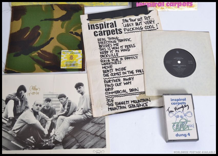 Inspiral Carpets - A 12" vinyl record ' Trainsurfing ' signed by the band along with a signed cassette tape, signed promo picture, signed ' Move ' 7" single, a sealed unopened ' Uniform ' 7" single, 'Joe ' flexidisc along with a set list