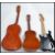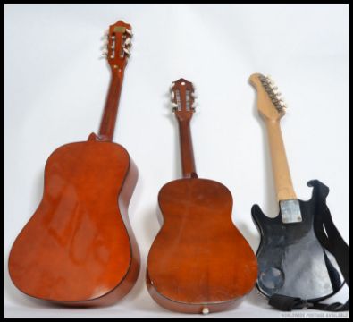Two acoustic guitars the first being a childs six string along with a three quarter sized six string and a three quarter sized six string electric guitar