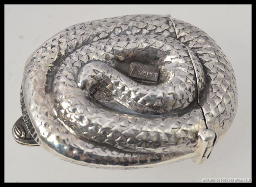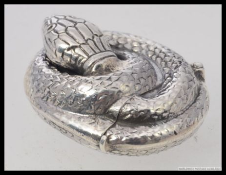 A white metal (marked ' sterling ' for silver ) antique style vesta in the form of a coiled snake.