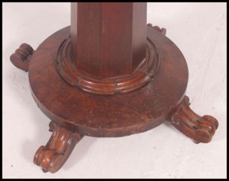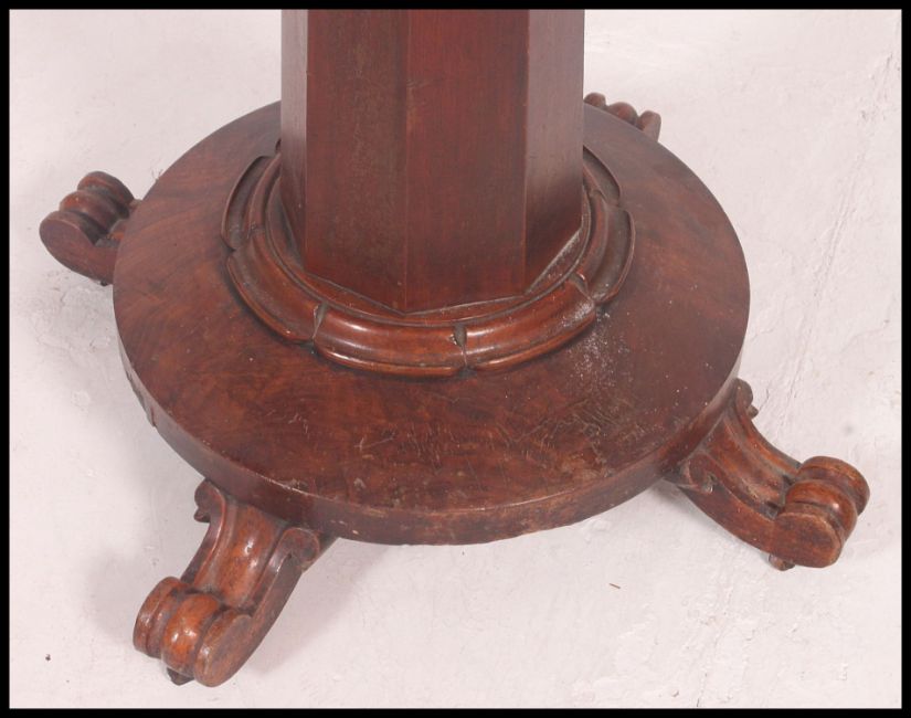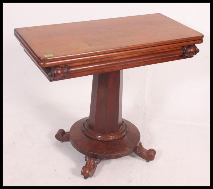 A Regency 19th century mahogany card table. Raised on quadruped base with carved column having flip over baize lined top. Embellished scroll work to the table frieze edges. H77 x W91 x D94cm