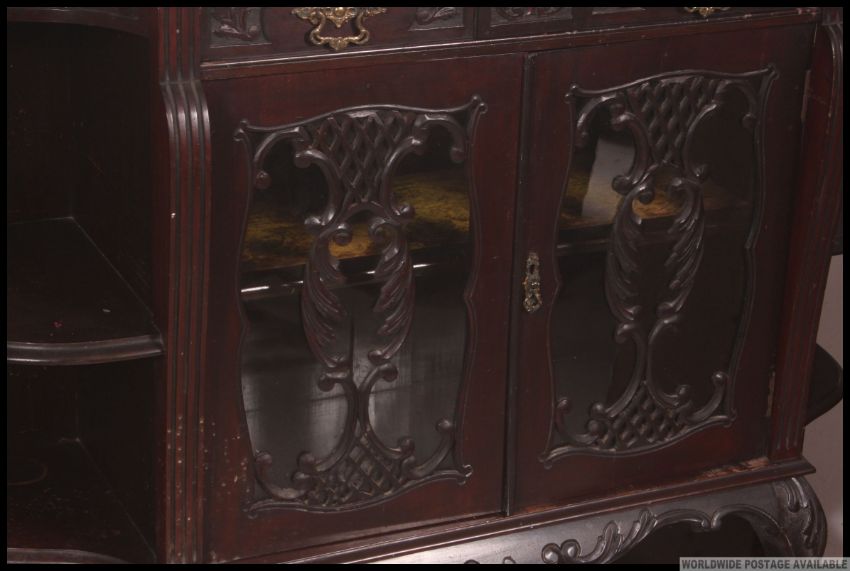 An Edwardian mahogany mirror back sideboard Chiffonier. The base with shaped end shelves and central glass cabinet. Atop a mirror back with column supports