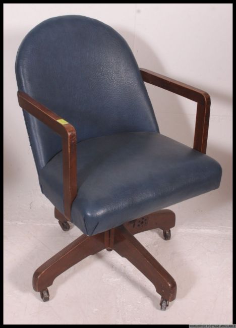 A 1950's mid century oak office swivel chair by Hillcrest. The oak quadruped base with swivel mechanism having vinyl seat above. H90 x W58 x D48cm