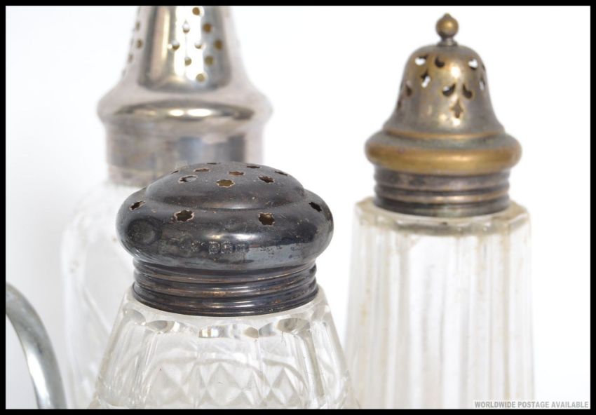 A collection of silver plated toast racks along with cut glass sugar castors some plated and some hallmarked silver