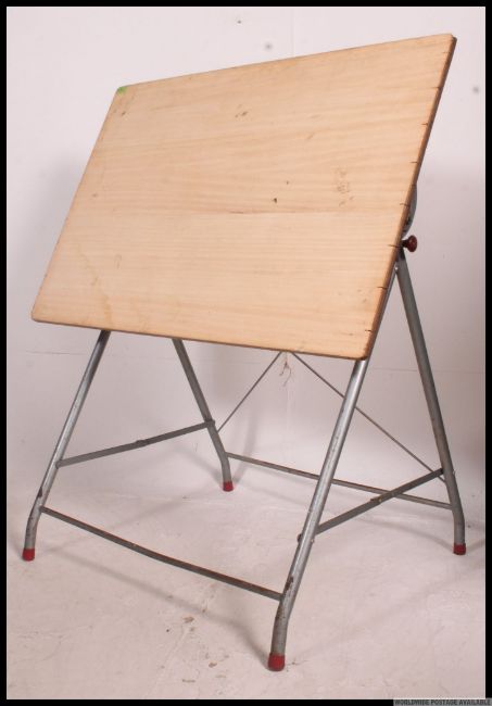 A mid century Industrial architects table having wooden angular work top. The folding base with scrup top above