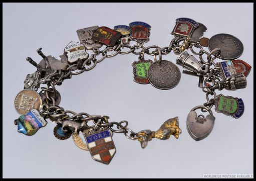 A silver white metal charm bracelet, adorned with various charms, many marked silver