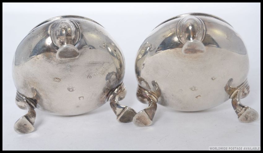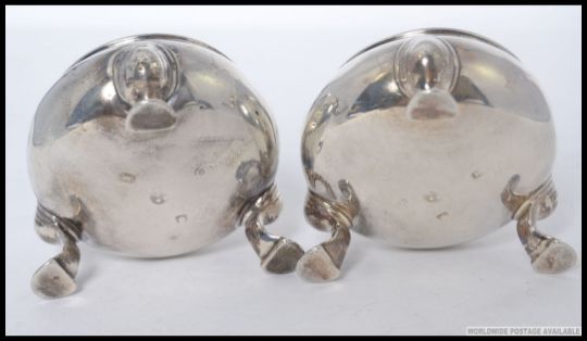 A pair of heavy solid silver antique hallmarked salts. Marks obscured to base, but each standing on three ball and claw feet. H4cm 89 grams