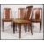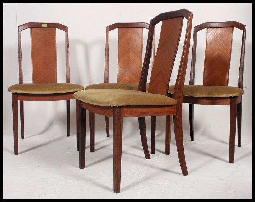 A set of 4 1970's retro teak and oak quarter veneer dining chairs. Raised on shaped legs with overstuffed seats having original fabric