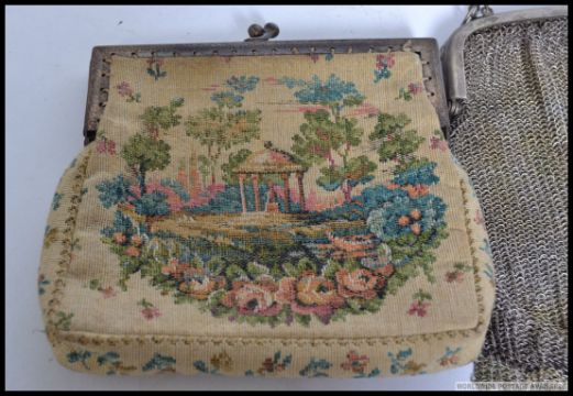 A large white metal silver plated mesh purse complete with chain strap. Together with a mid century needlepoint ladies purse