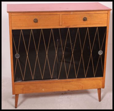 An excellent retro mid century red formica and smoked glass side / cocktail cabinet. Raised on tapered supports with sliding glass facia and red formica top above. Measures: 93 x 92 x 41 cm.