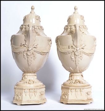A pair of Staffordshire stoneware Weedon urns with swag detailing H 45cm W 22cm