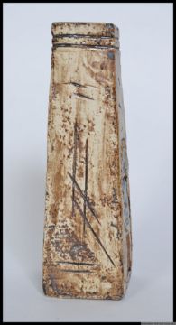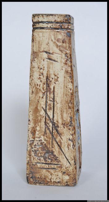 An original Troika pottery coffin vase with textured brown ground, domino embossed design to one side & arch design to the other bearing the monogram for Honor Curtis (HC) - 1969 to 1973. 17cm tall