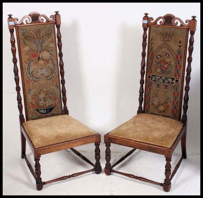 An excellent pair of Carolean design walnut high back chairs. The tall back rests with tapestry upholstered centres and seats. Raised on turned legs united by crinoline stretchers. 113x50x91cm